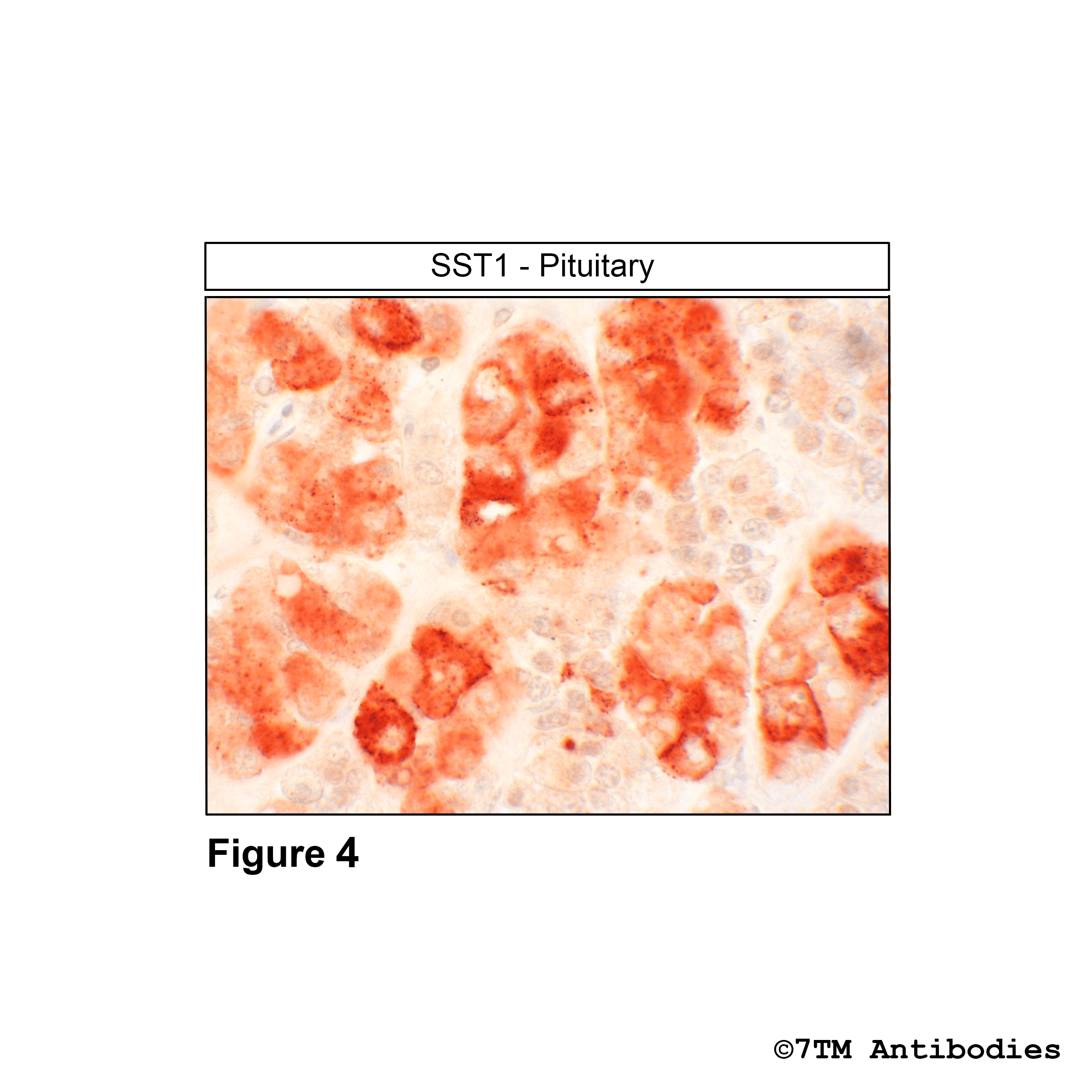 Figure 2. Immunohistochemical identification of Somatostatin Receptor 1  in human pituitary adenoma. Sections were dewaxed, microwaved in citric acid, and incubated with anti-SST1 (Somatostatin Receptor 1) antibody (7TM0355N-IC) at a dilution of 1:100. Sections were then sequentially treated with biotinylated anti-rabbit IgG and avidin-biotin solution. Sections were then developed in 3,3-diaminobenzidine (DAB)-glucose oxidase and lightly counterstained with hematoxylin. Note, high expression levels of SST1 receptors in all cells of pituitary adenoma.