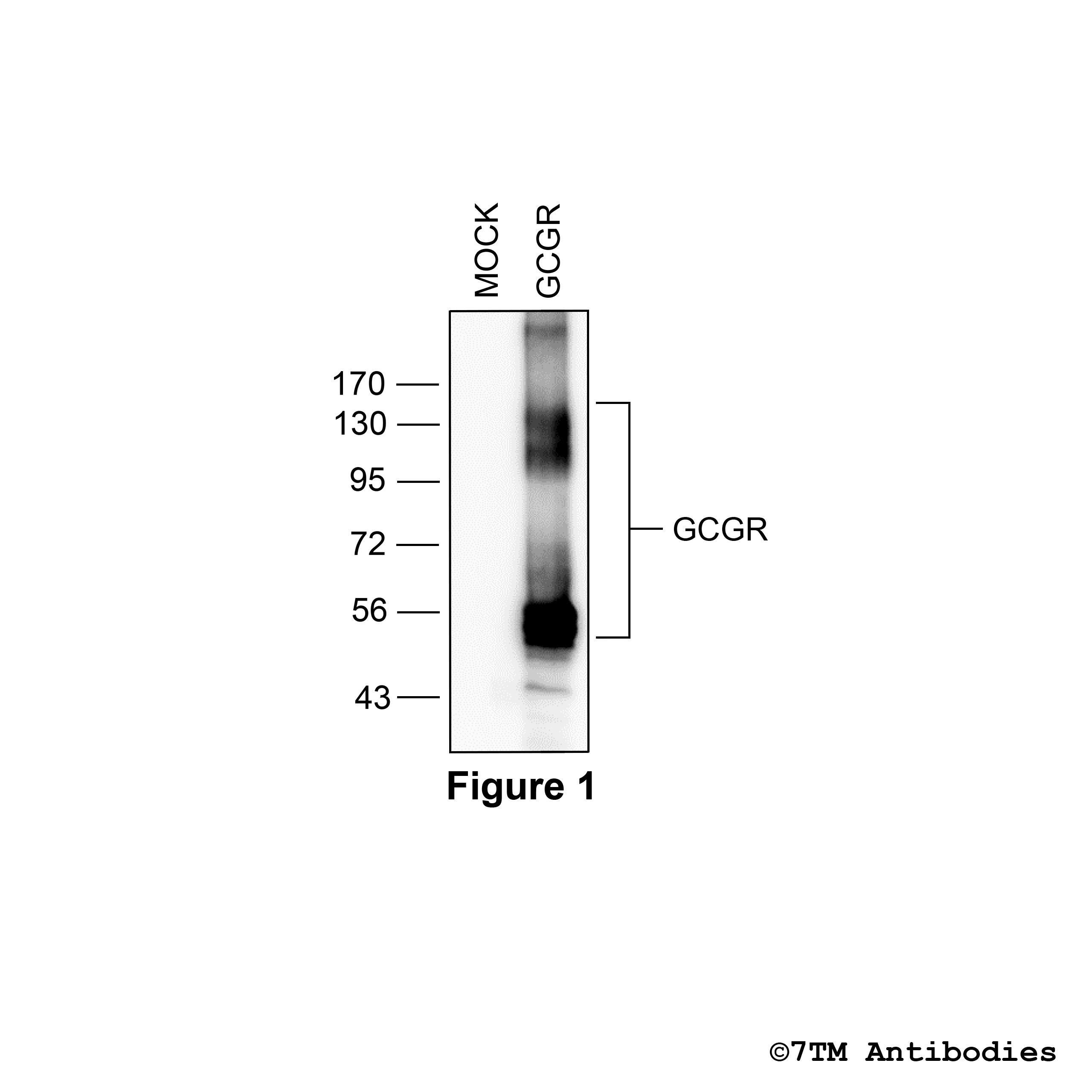 Figure 1. Validation of the Glucagon Receptor  in transfected HEK293 cells. Native HEK293 cells (MOCK) or HEK293 cells stably expressing the Glucagon Receptor  (GCGR) were lysed and immunoblotted with the anti-GCGR antibody (7TM0251N) at a dilution of 1:1000.