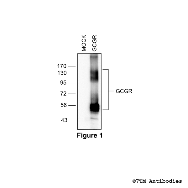 Figure 1. Validation of the Glucagon Receptor  in transfected HEK293 cells. Native HEK293 cells (MOCK) or HEK293 cells stably expressing the Glucagon Receptor  (GCGR) were lysed and immunoblotted with the anti-GCGR antibody (7TM0251N) at a dilution of 1:1000.