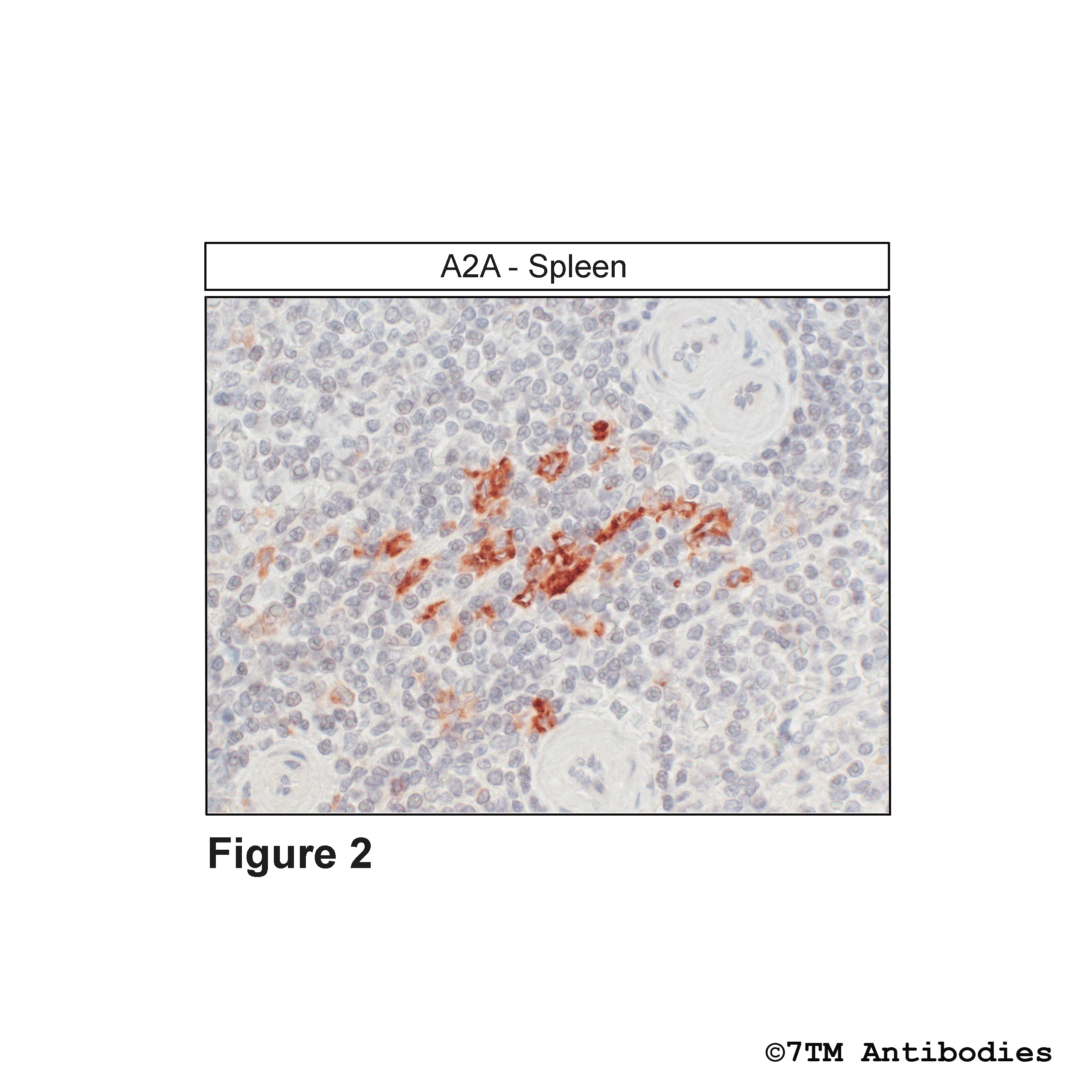 Figure 2. Immunohistochemical identification of the A2A Adenosine Receptor in spleen. Sections were dewaxed, microwaved in citric acid, and incubated with anti-A2A (A2A Adenosine Receptor) antibody (7TM0019N-IC) at a dilution of 1:100. Sections were then sequentially treated with biotinylated anti-rabbit IgG and avidin-biotin solution.Color was developed by incubation in 3-amino-9-ethylcarbazole (AEC), and sections were counterstained with hematoxylin.