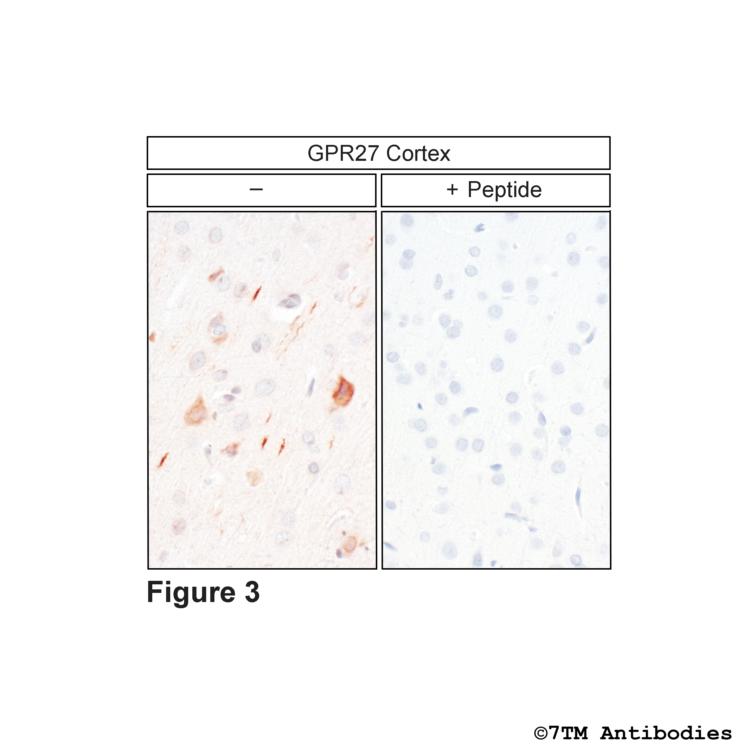 The GPR27 antibody is directed against the distal end of the carboxyl-terminal tail of mouse, rat and human GRP27. It can be used to detect total GPR27 receptors in Western blots independent of phosphorylation. The GPR27 antibody can also be used to isolate and enrich GPR27 receptors from brain lysates. It also detects GPR27 in cultured cells and tissue sections by immunohistochemistry.