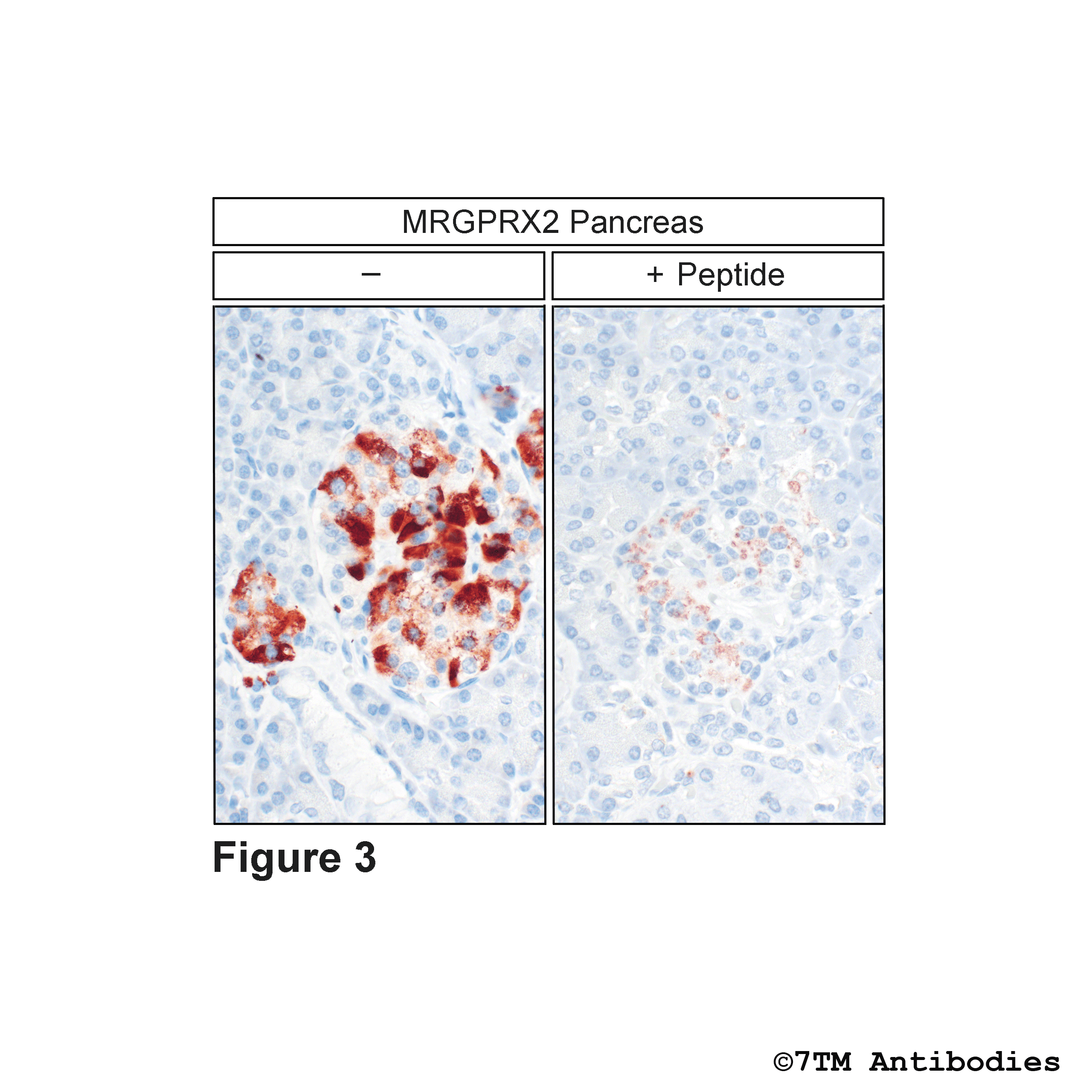 Figure 3. Immunohistochemical varification of  MRGPRX2 Receptor antibody in Pancreas. Sections were dewaxed, microwaved in citric acid, and not exposed (left pannel) or exposed to peptide (right pannel) that was used for production of anti-MRGPRX2 (non-phospho-MRGPRX2 Receptor)) antibody (7TM0157N-ICGP). Sections were then incubated with anti-MRGPRX2 (non-phospho-MRGPRX2 Receptor) antibody (7TM0157N-ICGP) at a dilution of 1:100 and sequentially treated with biotinylated anti-rabbit IgG and avidin-biotin solution. Sections were then developed in 3,3-diaminobenzidine (DAB)-glucose oxidase and lightly counterstained with hematoxylin. Note, only in sections without peptide incubation MRGPRX2 receptors were uniformly detected at the plasma membrane of cells.