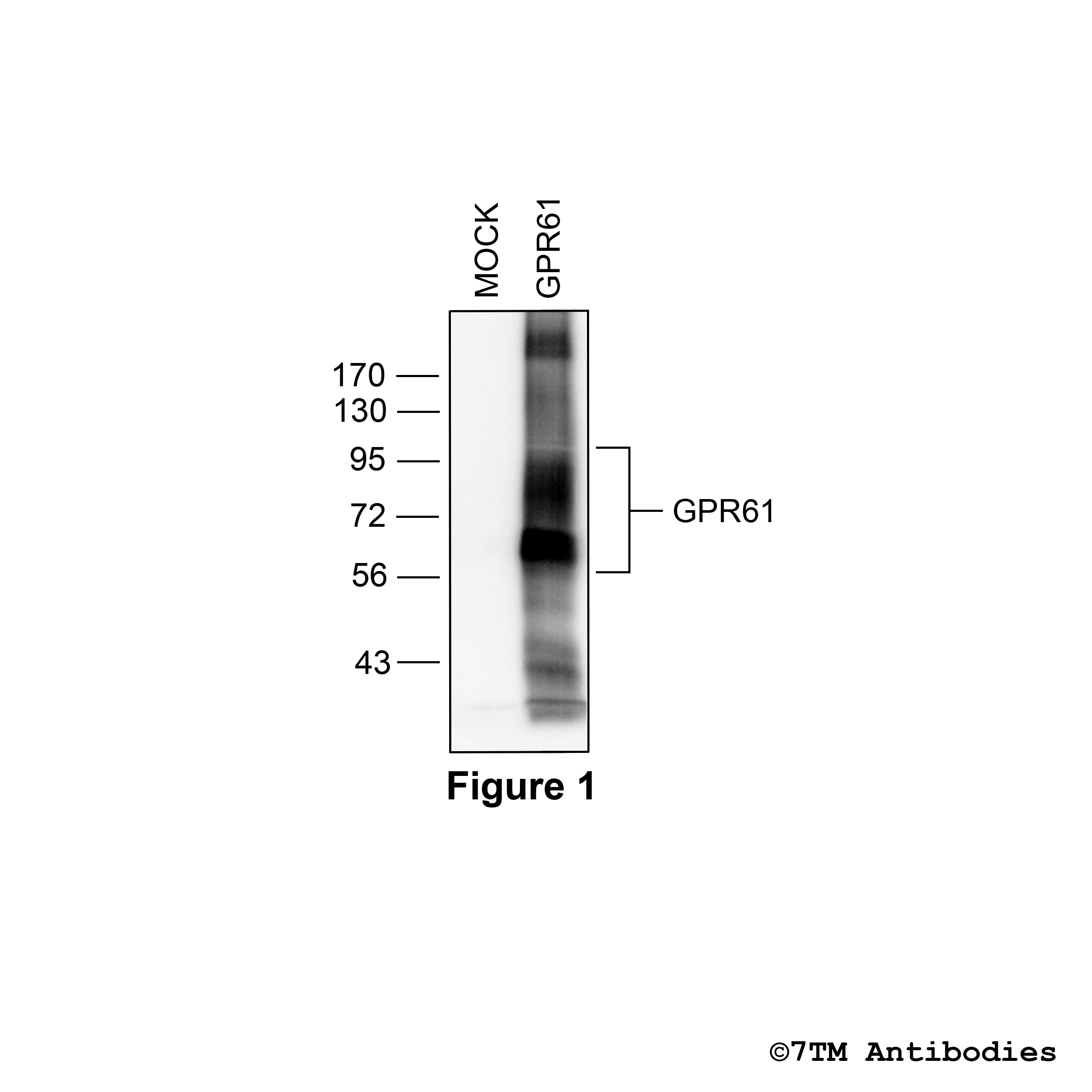 Figure 1. Validation of the GPR61 Receptor in transfected HEK293 cells. Native HEK293 cells (MOCK) or HEK293 cells stably expressing the GPR61 Receptor (GPR61) were lysed and immunoblotted with the phosphorylation-independent anti-GPR61 antibody (7TM0110N) at a dilution of 1:1000.