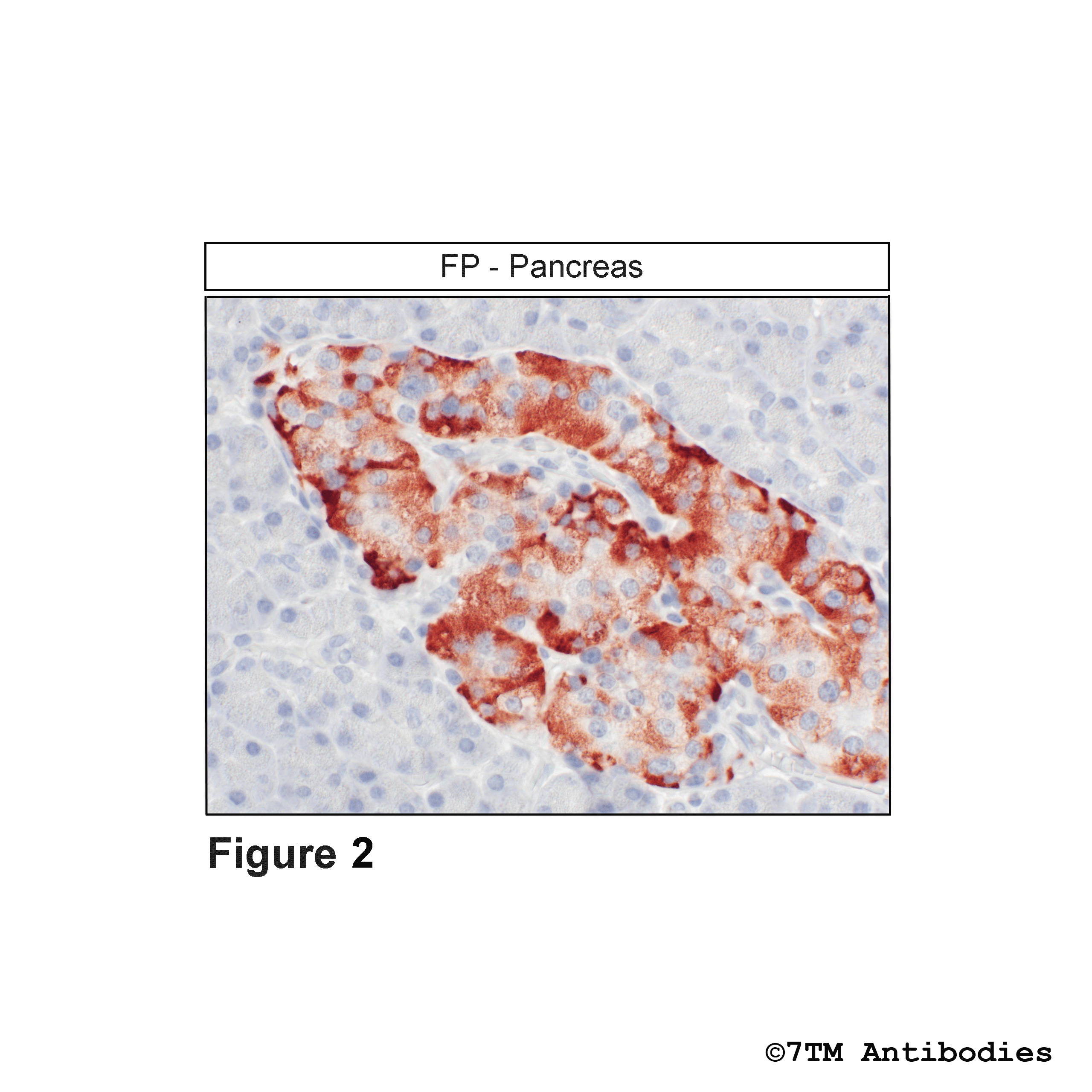 Figure 2. Immunohistochemical identification of FP Prostanoid Receptor in pancreas. Sections were dewaxed, microwaved in citric acid, and incubated with anti-FP (non-phospho-FP Prostanoid Receptor) antibody (7TM0344N) at a dilution of 1:100. Sections were then sequentially treated with biotinylated anti-rabbit IgG and avidin-biotin solution. Color was developed by incubation in 3-amino-9-ethylcarbazole (AEC), and sections were counterstained with hematoxylin.