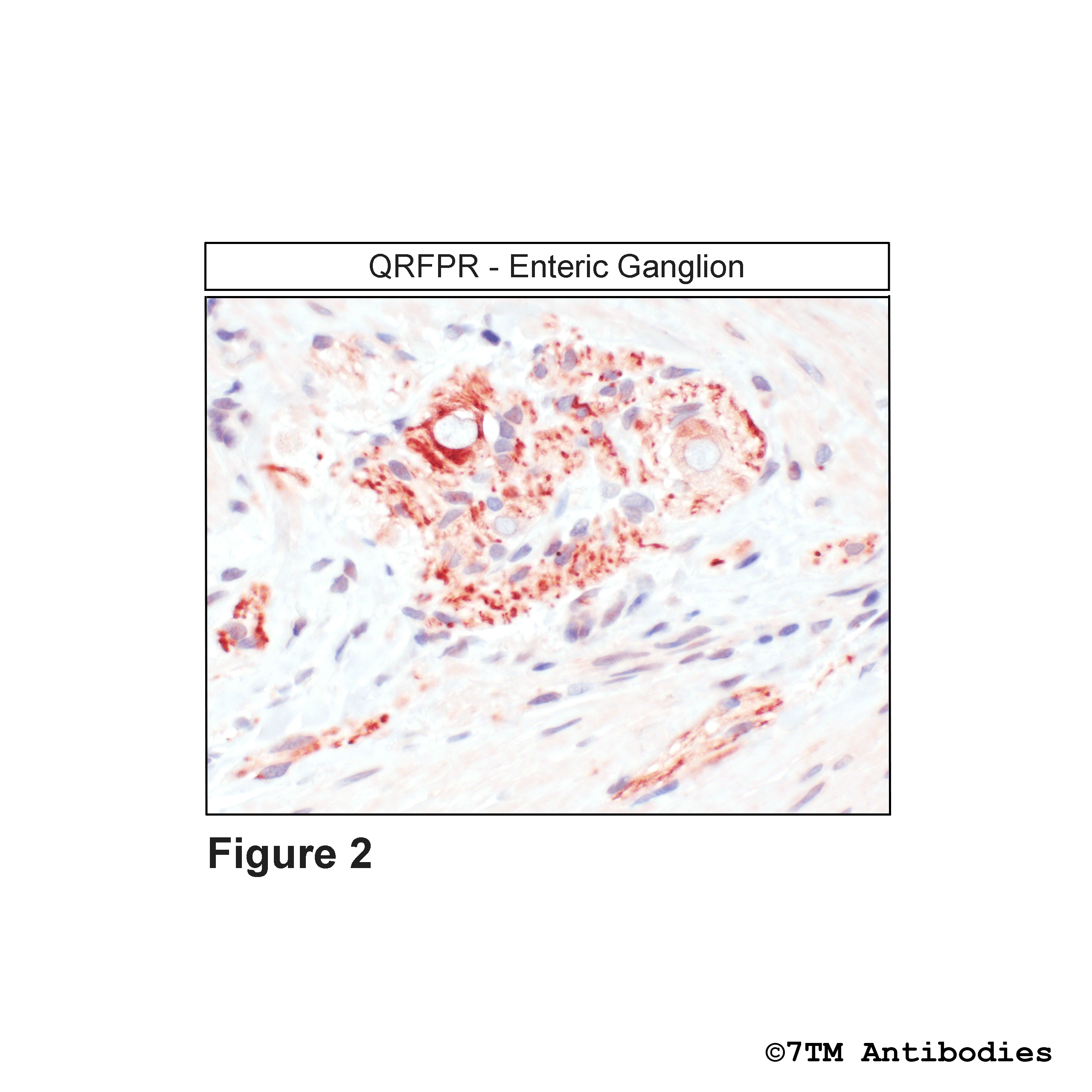 The non-phospho QRFP receptor antibody is directed against the distal end of the carboxyl-terminal tail human QRFP receptor. It can be used to detect total QRFP receptors in Western blots independent of phosphorylation. It can also be used to isolate and enrich QRFP receptors from tissue lysates. It also detects QRFP in cultured cells and tissue sections by immunohistochemistry.